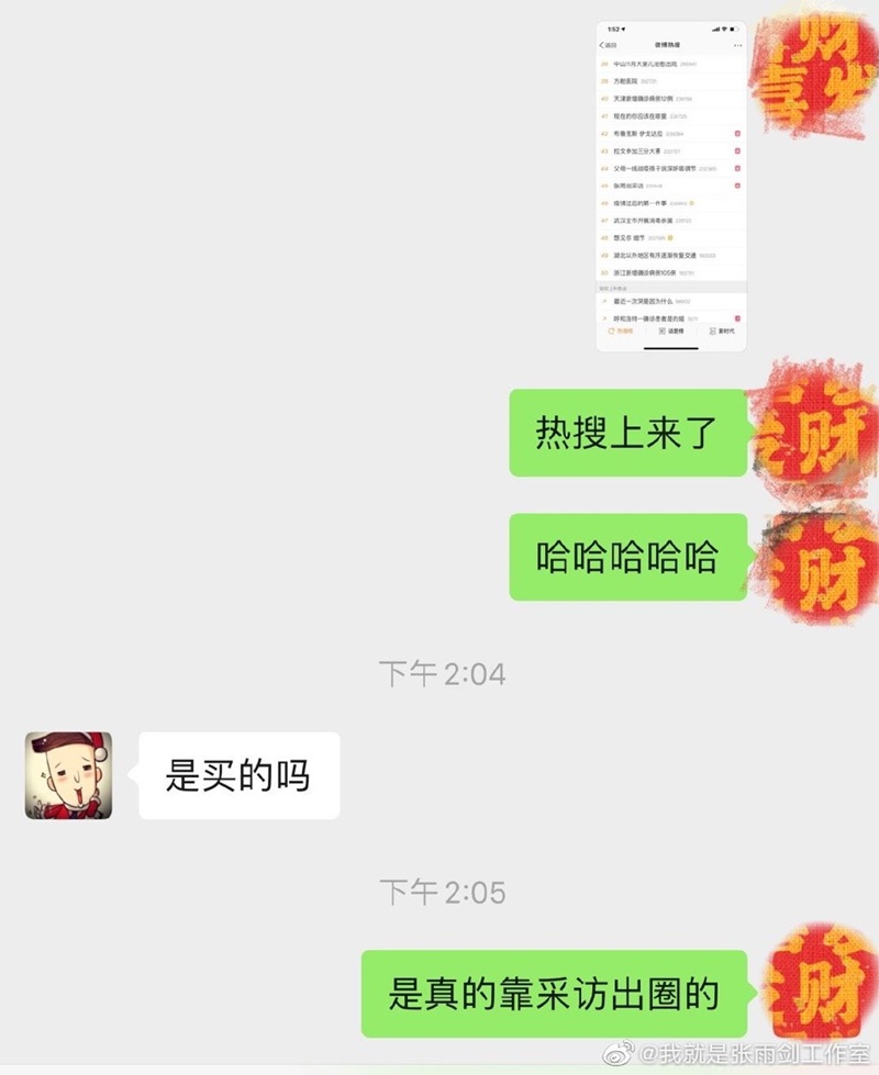 張雨劍得知自己登熱搜後,第一反應令網友都笑翻了,他的工作室團隊上傳了一張聊天截圖,內容是工作人員告知張雨劍登熱搜,張雨劍當下的反應竟是問工作室熱搜是買的嗎?