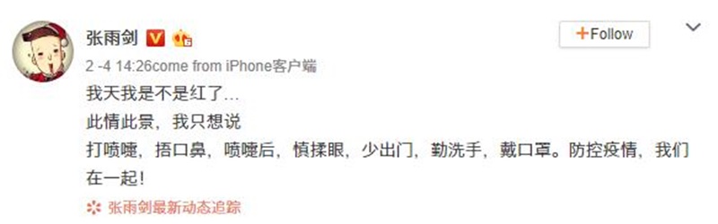 完全不敢相信自己人氣變高的張雨劍,不久後發了一條微博,說:「我天我是不是紅了?」最後還不忘幽默的提醒粉絲要多戴口罩,勤洗手。