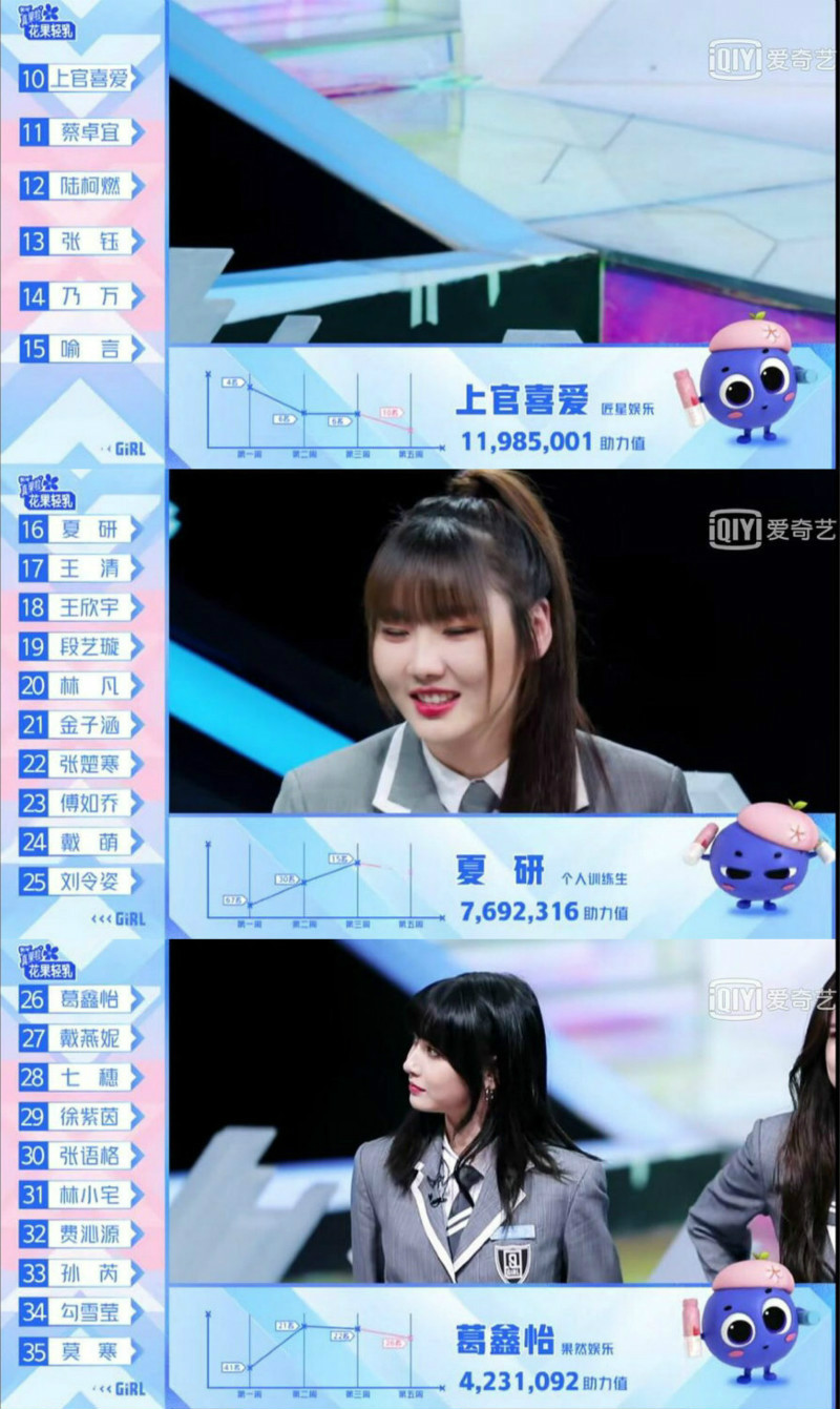 10~19 :上官喜愛、蔡卓宜、陸柯燃、張鈺、乃萬、喻言、夏研、王清、王欣宇、段藝璇