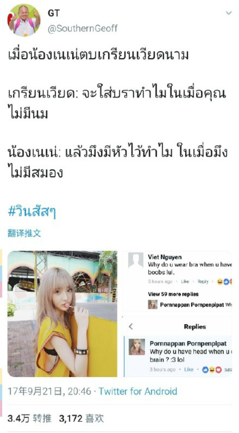 BUT,其實我們的甜妹也是非常有EQ又剛的哦!日前有泰國博主轉發了Nene之前在線懟鍵盤俠的貼文,在該帖文中,鄭乃馨曬出了自己的美照。照片中她身穿性感黃色背心,露出了自己的黑色bra。