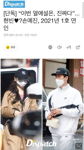 根據Dispatch,玄彬和孫藝珍已戀愛8個月左右。兩人合作了讓許多人陷入戀愛感的電視劇「愛的迫降」,並多次傳出在一起戀愛的傳聞。