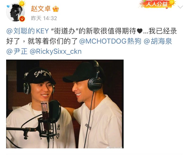 但沒想到驚喜來得這麼快!趙文卓更新微博,表示:「劉聰“街道辦”的新歌很值得期待❤…我已經錄好了,就等著你們的了!」並艾特了街道辦其他成員~而配圖則是他和自己的關門弟子在錄音室的合照~