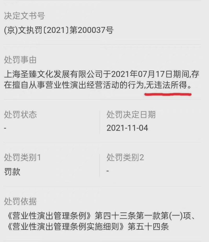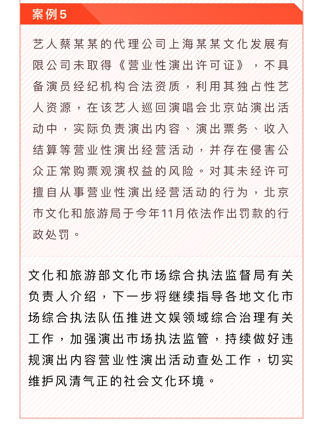 原來是中國文旅部通報了今年部分演出市場典型指導案例,當中提到了藝人蔡某某的代理公司上海某某文化發展有限公司未取得《營業性演出許可證》,不具備演員經紀機構合法資質,利用其獨占性藝人資源,在該藝人巡回演唱會北京站演出活動中,實際負責演出內容、演出票務、收入結算等營業性演出經營活動,並存在侵害公衆正常購票觀演權益的風險。對其未經許可擅自從事營業性演出經營活動的行為,北京市文化和旅遊局于今年11月依法作出罰款的行政處罰。