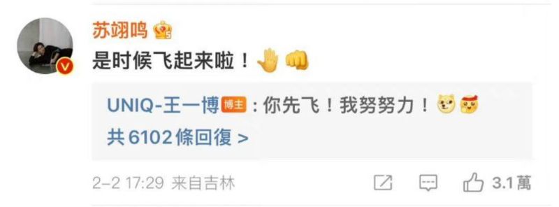 而蘇翊鳴也留言:「是時候飛起來啦!」鮮少回復的王一博上線,表示:「你先飛!我努努力!」重點…居然少見的加上了表情符號!!!!!媽啊!!!好久沒看見這麼可愛的王一博了啊!