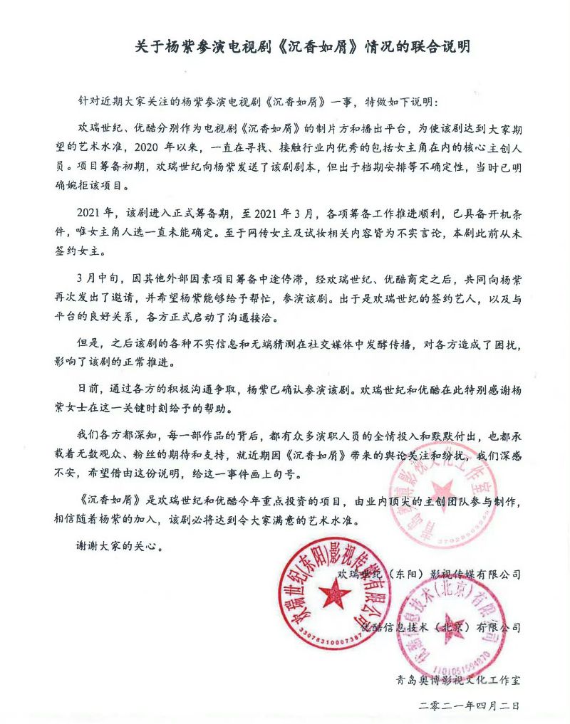 也因為「逗號」問題,不少網友開始「審判」楊紫過往的官宣貼文,當中和成毅的《沉香如屑》先是三方發聲明,表示她是來“救場”的👇