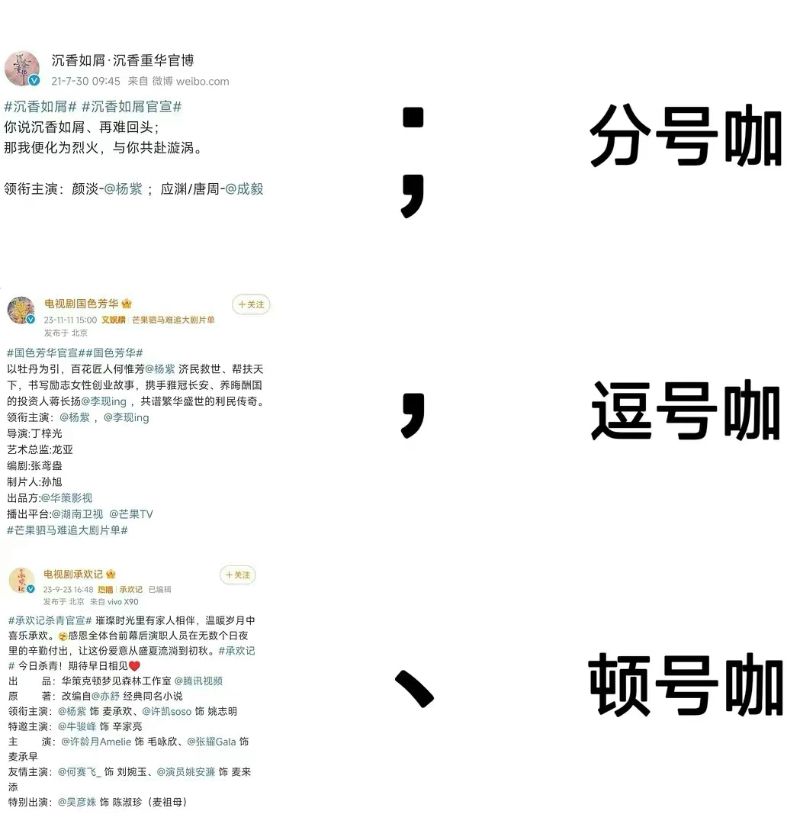 網友調侃楊紫出演《沉香如屑》要三個公章+分號;出演《長相思》和《要久久愛》要單獨一行;出演《承歡記》要頓號;因為和李現關係不錯,出演《國色芳華》做了最大讓步,只要一個逗號。於是,成毅變成了網友口中的「分號咖」、李現變成了「逗號咖」、最後許凱是「頓號咖」👇