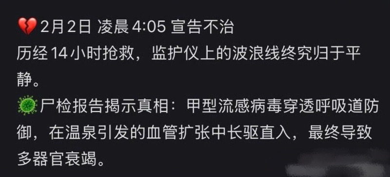 死亡結論:甲型流感病毒穿透呼吸道防禦,在溫泉引發的血管擴張中長驅直入,最終導致多重器官衰竭。