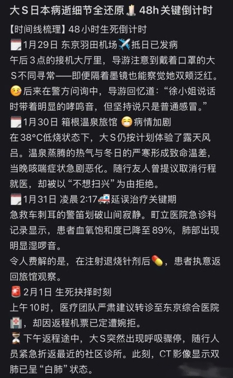 1月30日,箱根溫泉旅館。病情加劇,在38℃低燒狀態下,大S仍按計畫體驗了露天風呂。溫泉蒸騰的熱氣與冬日的嚴寒形成致命溫差,當晚咳喘症狀急劇惡化。隨行友人曾提議取消行程就醫,卻被以「不想掃興」為由拒絕。