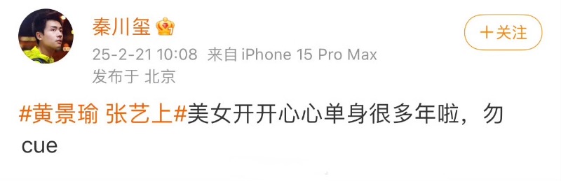 無論如何,張藝上前公司天浩盛世副總經理秦川璽發文,否認張藝上黃景瑜戀情:「美女開開心心單身很多年啦,勿cue。」