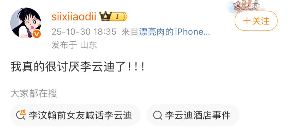 結果沒想到30號這天,她突然發文表示自己很討厭李雲迪了👇