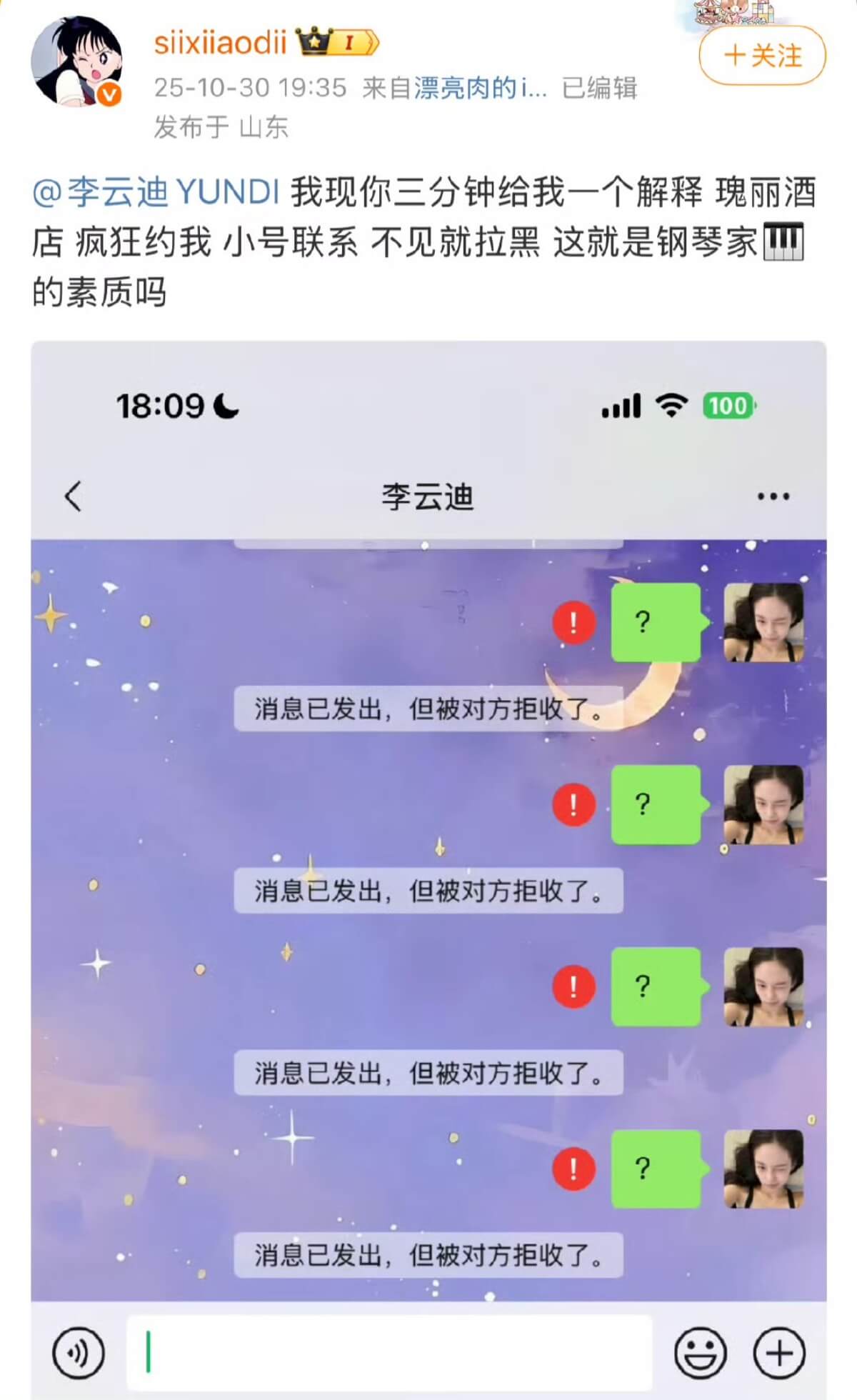 隨後喊話李雲迪,表示:「我想請問李雲迪先生,你想睡我,把我帶到酒店,趁我吃了安眠藥已經安靜入睡,但不知道你做了什麼齷齪的勾當,然後又拉黑我是什麼操作啊偉大的鋼琴家」隨後刪除了這條評論!
