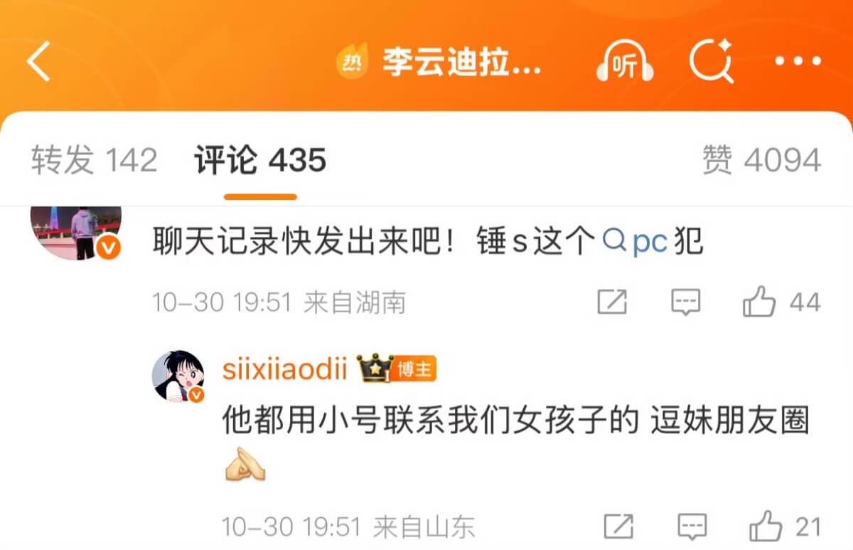 司曉迪還在評論區爆料,李雲迪專用小號聯繫女生,並表示自己還有很多料,誰惹就爆誰!