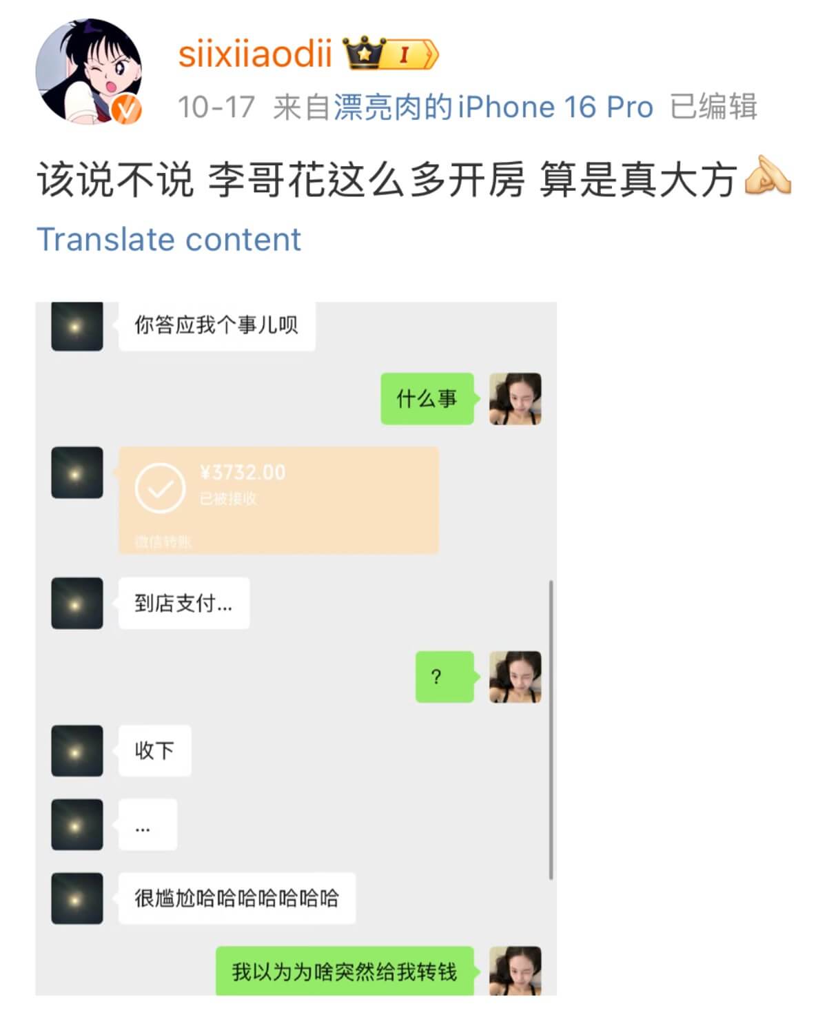 這裡先科普一下,司曉迪當初是被辛雨錫曝光爲秦霄賢出軌對象,後曬出與秦霄賢打遊戲合照。然後在2025年2月,又指控李汶翰「與多人保持曖昧關係」,並曝光聊天記錄。本月17號,她曬出了和李汶翰的聊天記錄,表示他在開房這方面挺大方。