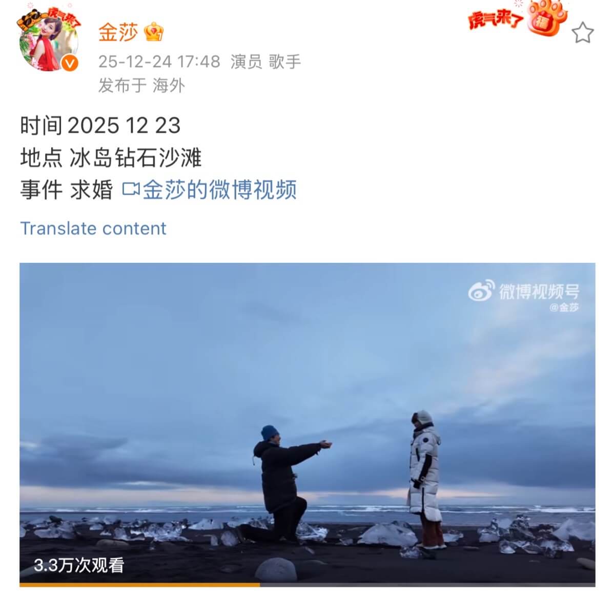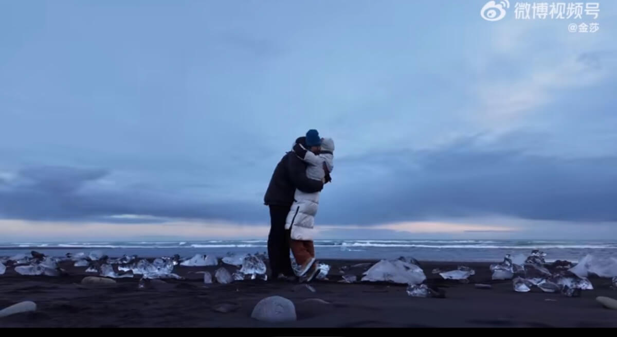 沒想到在平安夜這天,金莎公開了孫丞瀟求婚影片,只見兩人在海邊,孫丞瀟背著金莎跪下後,金莎回頭才發現被求婚了!!!
