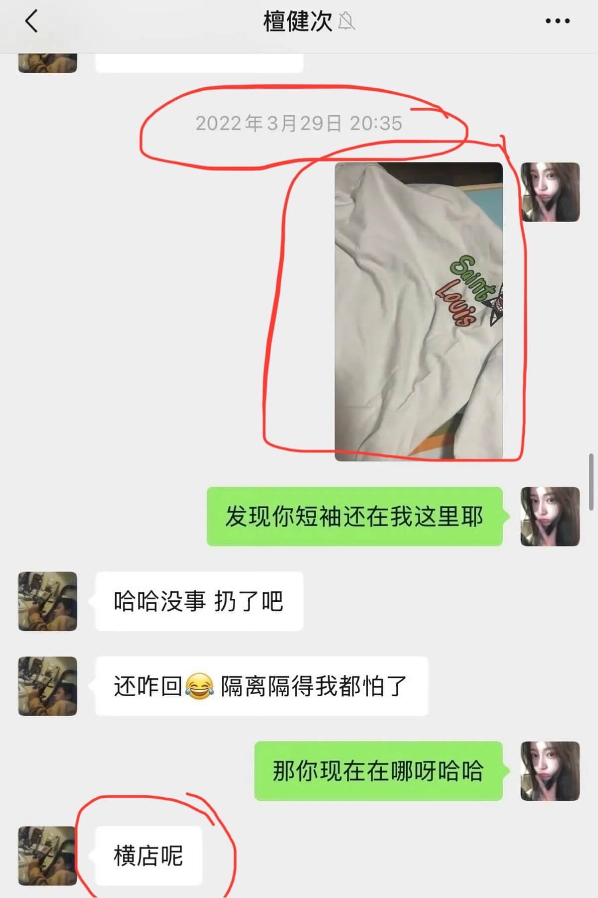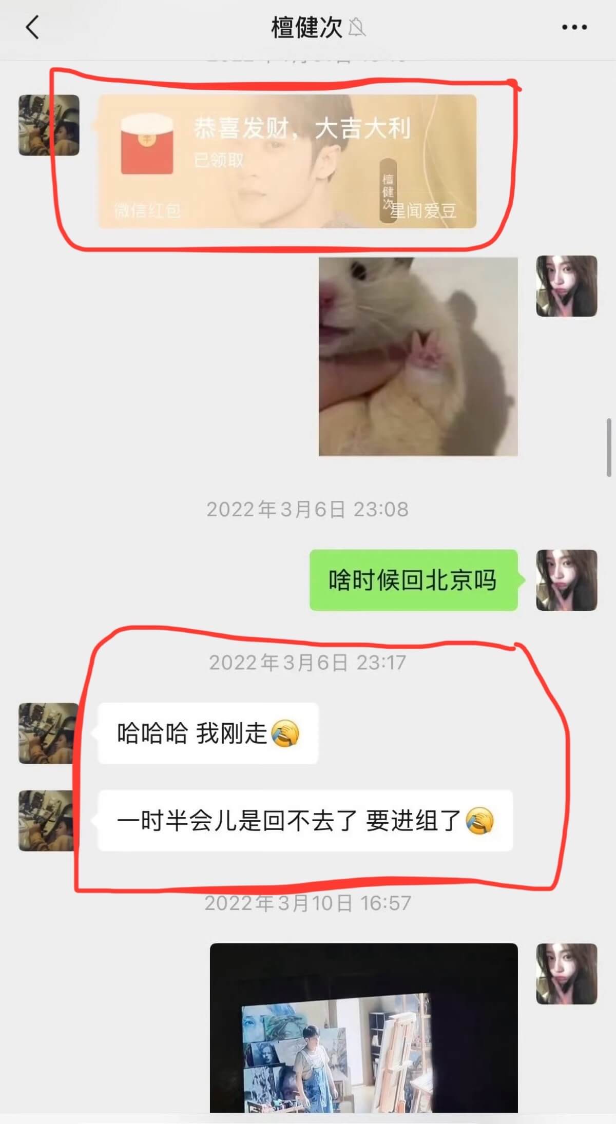 聊天記錄中不但發了自己封面圖的紅包,還提到23年3月要進組了,另一張同月記錄中提到自己在橫店👇