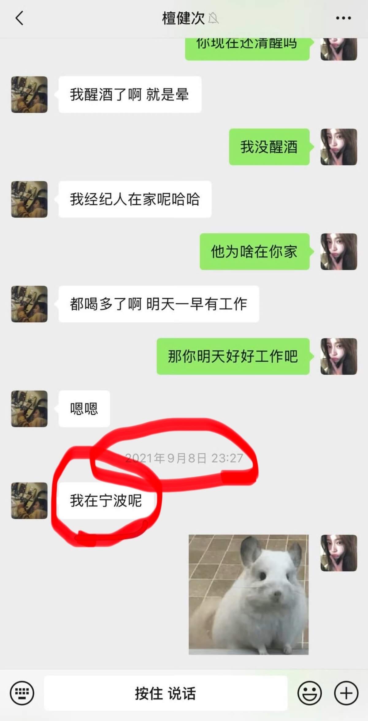 另外,在聊天記錄中,21年提到了自己在寧波👇