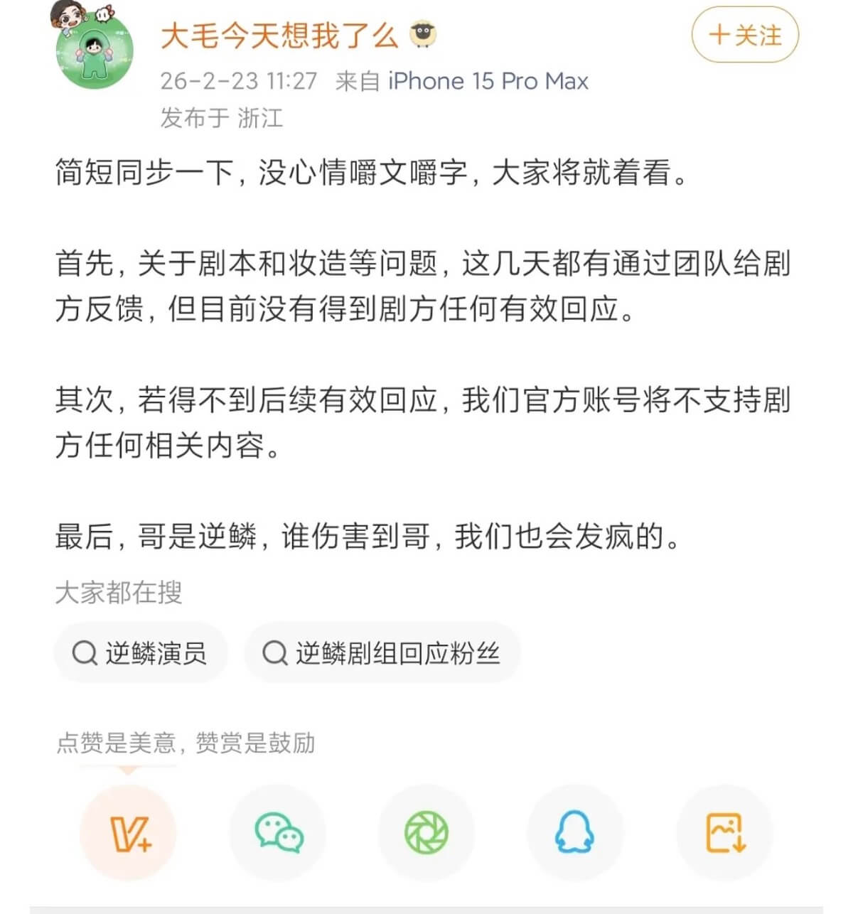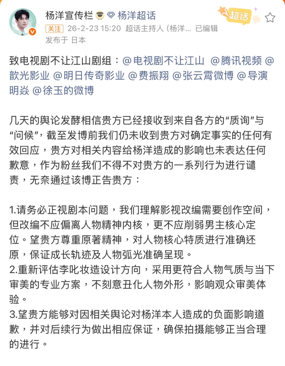 但楊洋對接方卻罕見的下場維權,喊話劇組針對網傳魔改事情回應👇