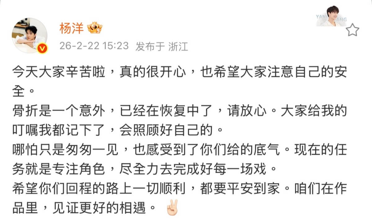 引起關注之後,楊洋本人發文回應,表示自己手傷無礙👇