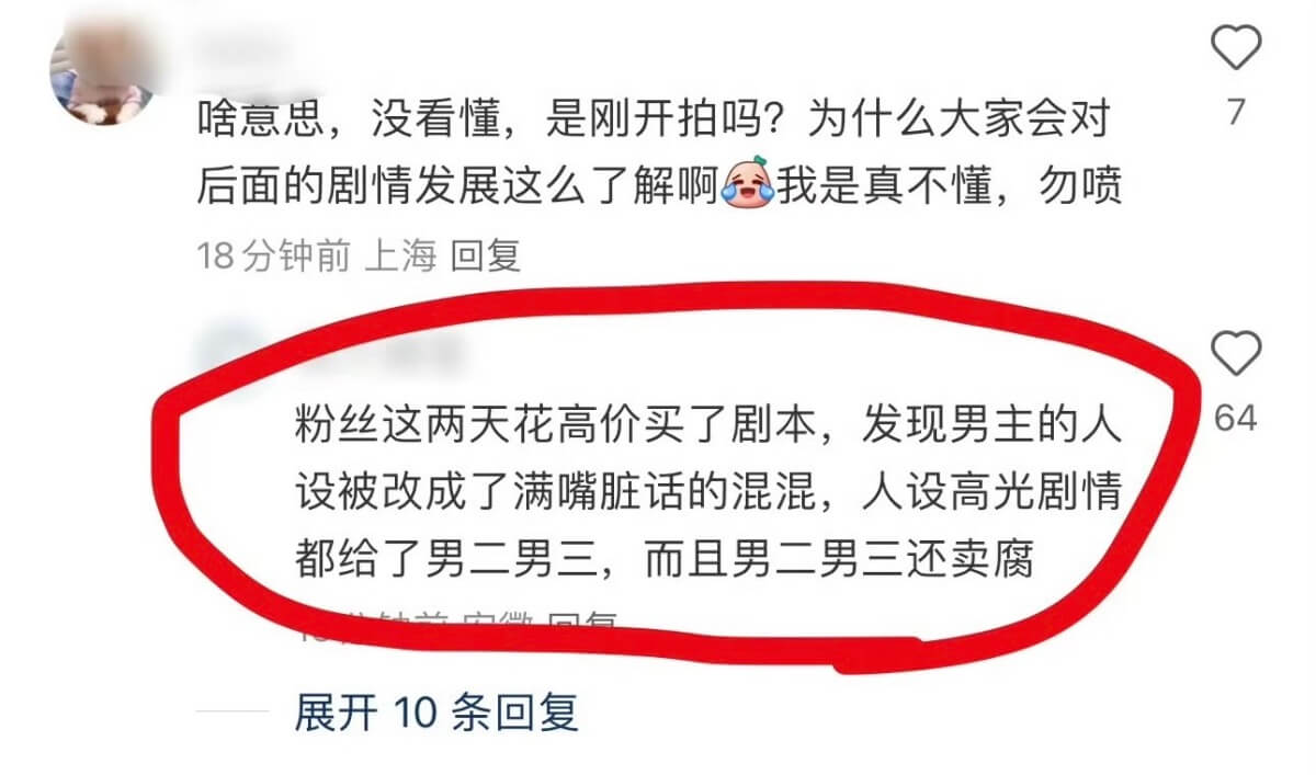 此外,有網友傳楊洋粉絲花錢買了劇本,發現原本屬於大男主的《不讓江山》,將很多高光時刻轉給了男二和男三,甚至男二和男三還有賣腐情節👇