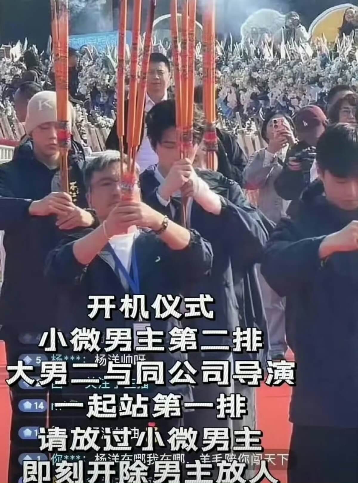 另外,開機典禮上的站位也引起不滿!來看看~網傳開機典禮上,身為男主的楊洋居然站在第二排,而男二翟子路和導演則站在第一排👇
