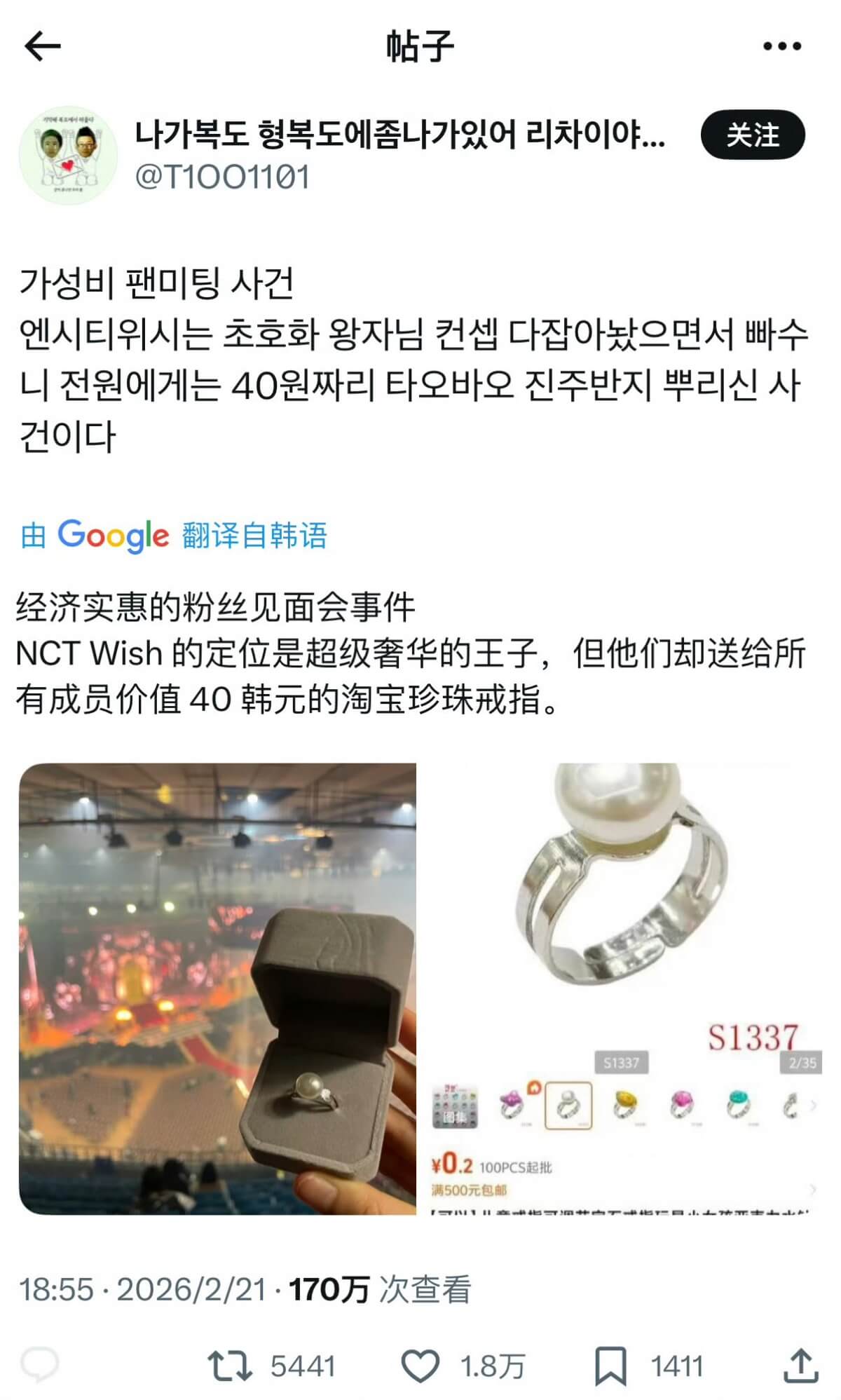 重點是,網友發現這枚戒指在中國購物網上,居然只定價兩毛錢人民幣,折合約40韓元👇
