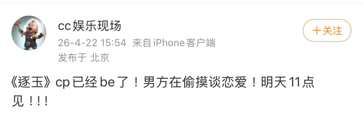 結果又迎來BE壞消息?是達,有狗仔預告,表示《逐玉》CP BE了,男方正在偷偷戀愛,並預告要在23號曝光詳情👇