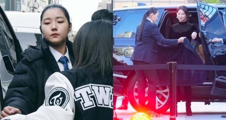 秀智下車前就有男女保鏢等候,男保鏢拉開車門,而女保鏢就在旁拿著毛毯?當她一下車,女保鏢立刻打開毛毯,遮擋了秀智的下半身。原來秀智的裙子比較短,女保鏢擔心她會走光,才會貼心地用毛毯擋住視線。看到女保鏢這麼貼心,秀智對她微笑致謝呢~