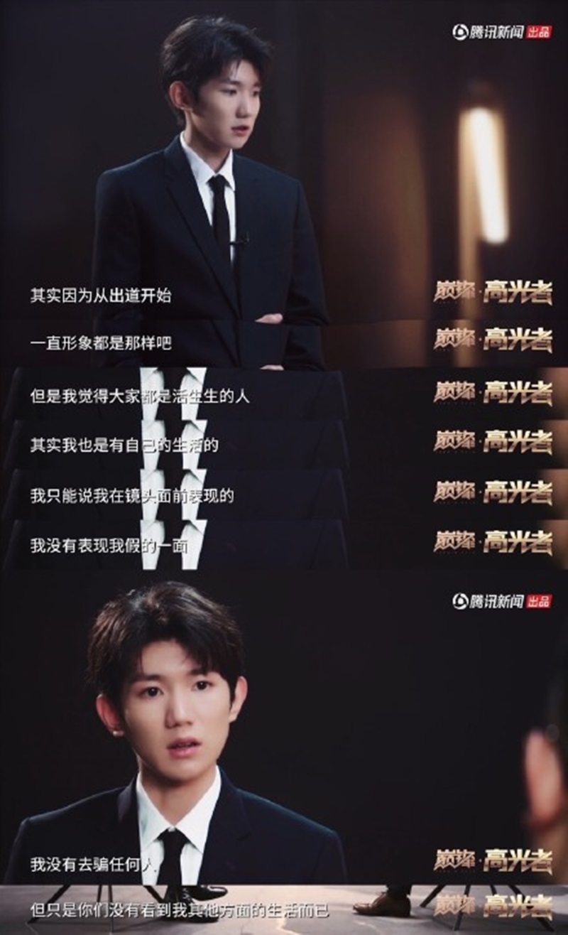 主持人接著說到因為王源有著乖小孩的形象,所以不管在哪裡抽煙,很多人都沒辦法接受王源有抽菸的習慣,問到王源會不會因此覺得受到不公平對待,他說:「我覺得大家都是活生生的人,其實我也是有自己的生活,我只能說我在鏡頭前表現的,我沒有表現我假的一面。我沒有去騙任何人,但只是你們沒有看到我其他方面的生活而已。」