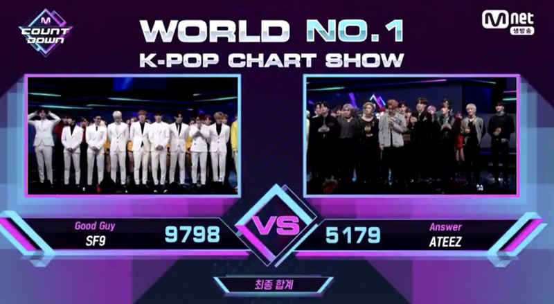 不但如此,《Good Guy》音源成績也相當不俗,而他們在17日成為《M!Countdown》音樂節目一位候補,與另一組實力和人氣火爆的男團ATEEZ角逐出道首個一位!成績揭曉,SF9以9798分力挫ATEEZ的5179分,摘下了自2016年出道以來的第一座音樂節目獎杯。
