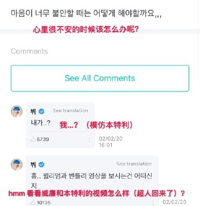 除了Joy外,原來V也是威本的小粉絲哦!有粉絲在Weverse問「心裡感到焦慮不安時該做些什麼?」,V先是留言寫「我嗎…?」這句是在模仿本特利,在聽到爸爸讓他點餐時,疑惑回答時的語氣。接著V寫道:「嗯…看看威廉和本特利的視頻如何?」