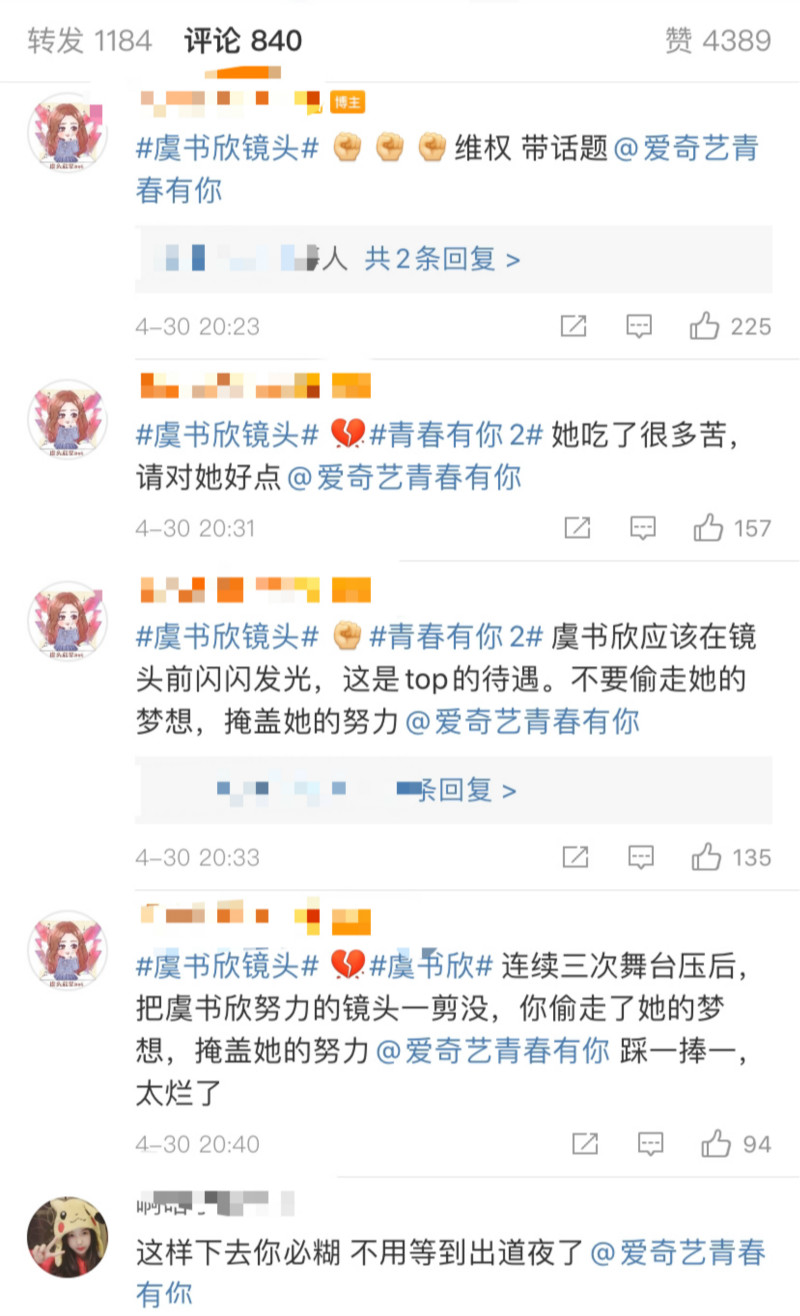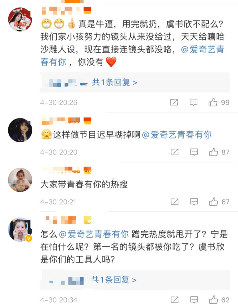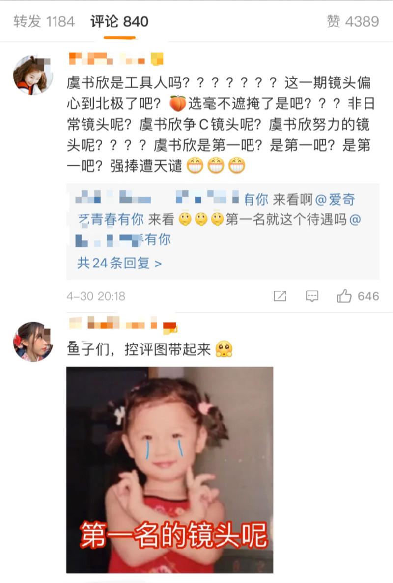 於是很多虞書欣的粉絲紛紛抗議,覺得製作單位沒有心,仿佛一開始就利用虞書欣炒話題,現在節目收視穩定了,就乾脆放棄了虞書欣的鏡頭,明明她就是連續好幾期第一,怎麼可能鏡頭會這麼少~