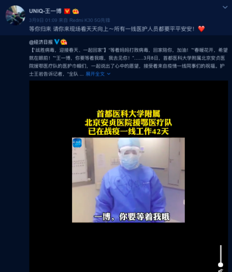 追索回去,這個約定起源於38婦女節的時候,當時有媒體拍攝了前線醫護人員的願望視頻,其中一位護士是王一博的粉絲,於是她在視頻中說了句:「一博,你要等著我哦!」沒想到王一博居然轉發了這則貼文,並表示:「等你歸來,請你來現場看天天向上~」
