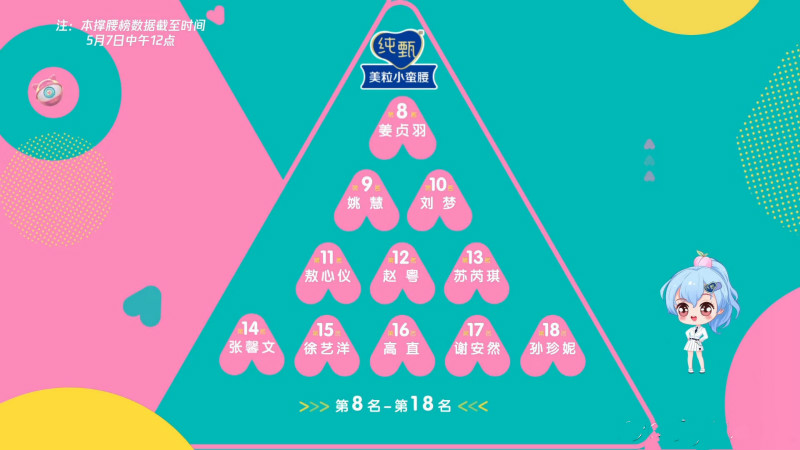 第8~18名:姜貞羽、姚慧、劉夢、敖心儀、趙粵、蘇芮琪、張馨文、徐藝洋、高直、謝安然、孫珍妮