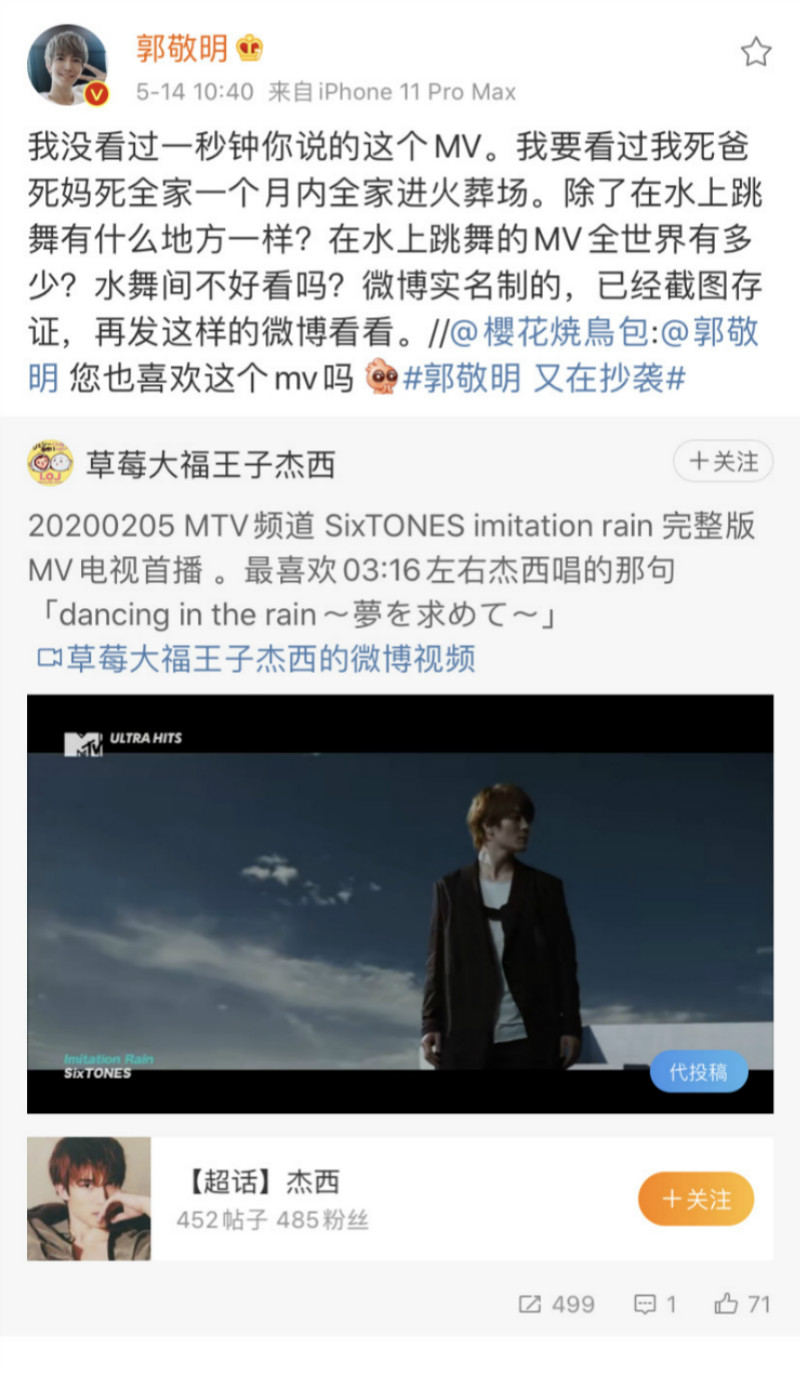 但是呢,竟然有網友質疑這個部分的情節,是郭敬明抄襲日本團體SixTONES的MV。