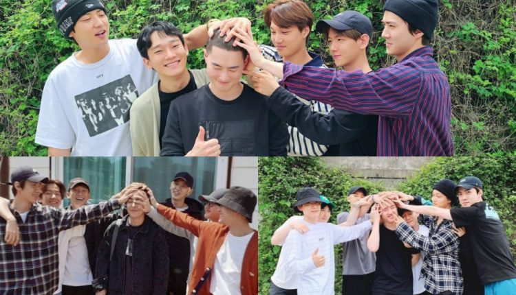 同時,也不忘要分享SUHO剃了寸頭後,被成員們“團抱摸頭殺”的合照!
