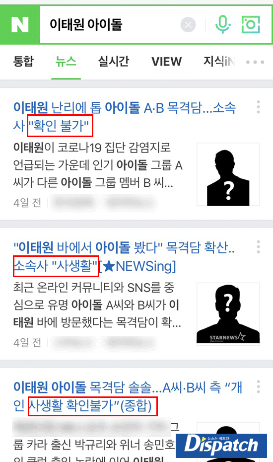 Dispatch表示確認了在4月25日晚至26日清晨,聚集在梨泰院的愛豆組合是“97line”的防彈少年團田柾國,Astro車銀優,NCT鄭在玹,Seventeen金珉奎。4人去了位於梨泰院的餐廳和娛樂設施2個地方。