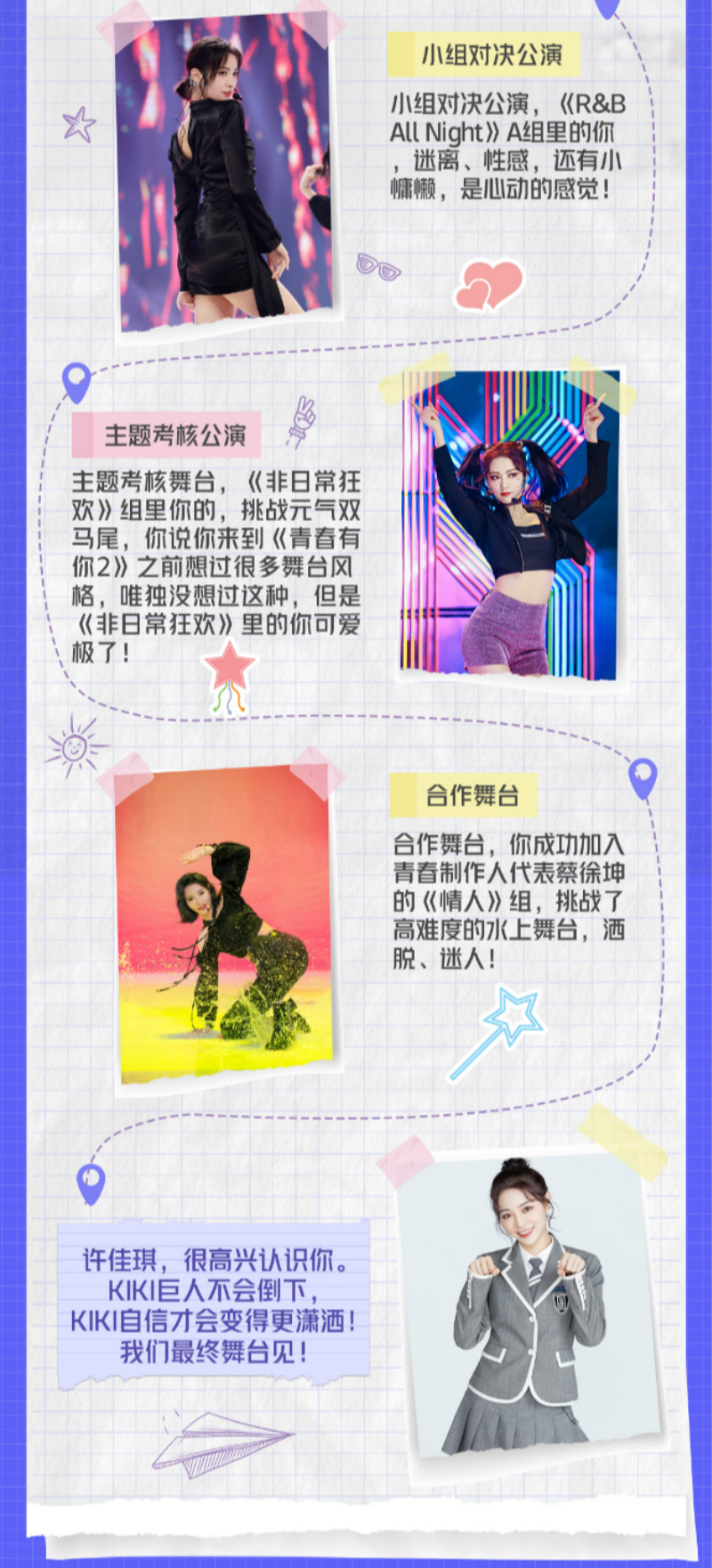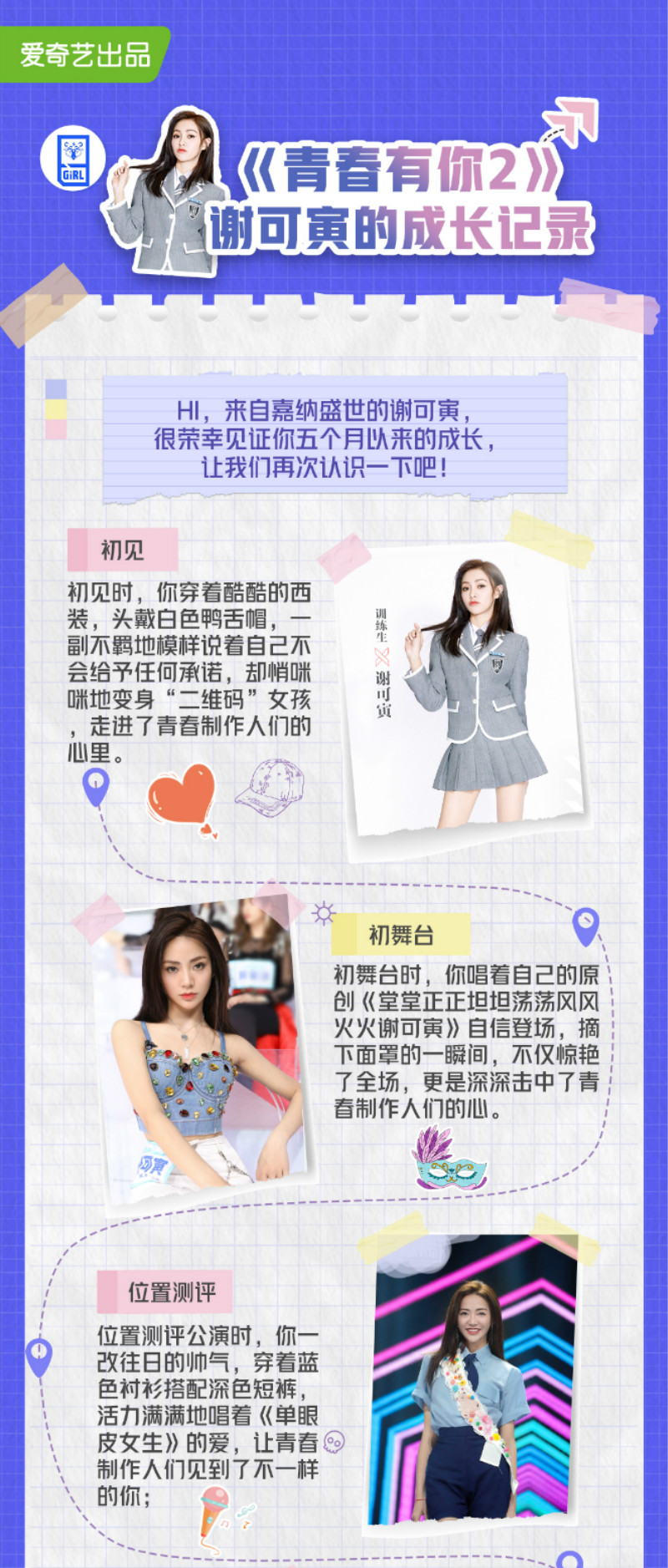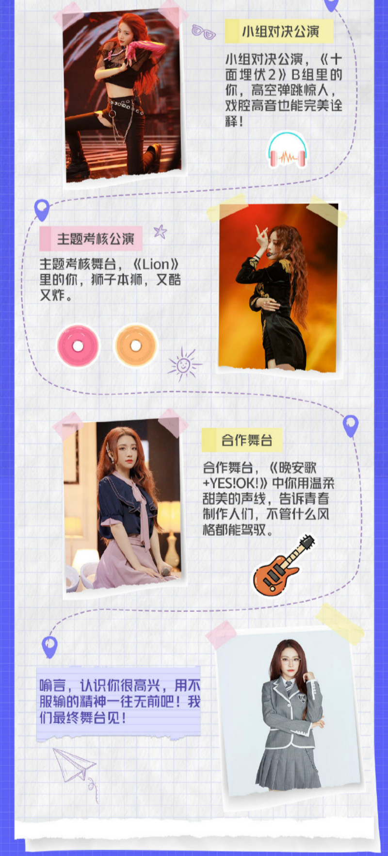 “從《Play》到《有點甜》再到《十面埋伏2》和《Lion》,我每一次都很開心,我只要站在舞台上就很開心”。五個月的時間,你不斷挑戰自我,嘗試不同的風格,讓青春制作人們看到了“無限可能”的你!未來的路還很長,期待你帶給我們更多驚喜~