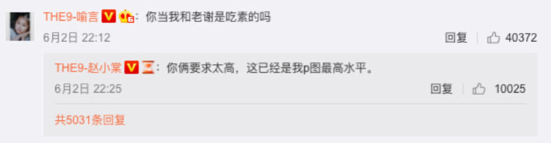 結果我們的忙內不開熏了,留言表示:「你當我和老謝是吃素的嗎?」趙小棠也立馬回復,表示「你倆要求太高,這已經是我p圖最高水平。」
