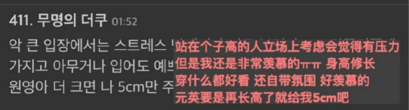 也有網友表示自己也是個子太高,所以特別能體會張元英的心情呢!「我也是在初中2年級的時候長到了170,在172、173的時候就停下來了,感覺能夠體會到元英的心情」。