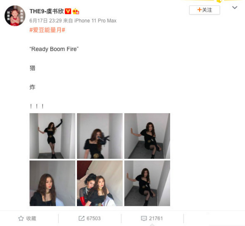 結果虞書欣就在微博小號發文解釋是裙子特意改定的關係,「就不能好好的嗎?做人多一點善良不行嗎,老師因為裙子特意規定改成我踢的這個高度,別人穿褲子想踢高一點不行嗎?第一次首秀舞台我能踢高干嘛要滑水。還有,合影我想發誰就發和誰,我是不能交朋友了對嗎?我再說一次,我會努力做好每一件事,也希望大家都能開開心心的。我會做好我的本職工作,其他別來干涉我,你們說的建議我會聽,無禮的我也不會理。以後也會有無數個微博來解釋沒有道理的事情。路很長,公道自在人間。看完這段話的粉絲,如果你們愛我,也希望你能愛大家!」在發文中還附上了被質疑是「划水」的舞蹈動作視頻和THE9的大合照。