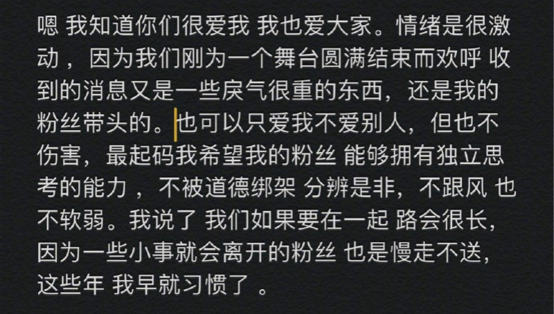 虞書欣也在評論區表示:「嗯,我知道你們很愛我,我也愛大家。情緒是很激動,因為我們剛為一個舞台圓滿結束而歡呼。收到的消息又是一些戾氣很重的東西,還是我的粉絲帶頭的。也可以只愛我不愛別人,但也不傷害,最起碼我希望我的粉絲,能夠擁有獨立思考的能力,不被道德綁架,分辨是非,不跟風,也不軟弱。我說了 我們如果要在一起,路會很長,因為一些小事就會離開的粉絲,也是慢走不送,這些年,我早就習慣了。」