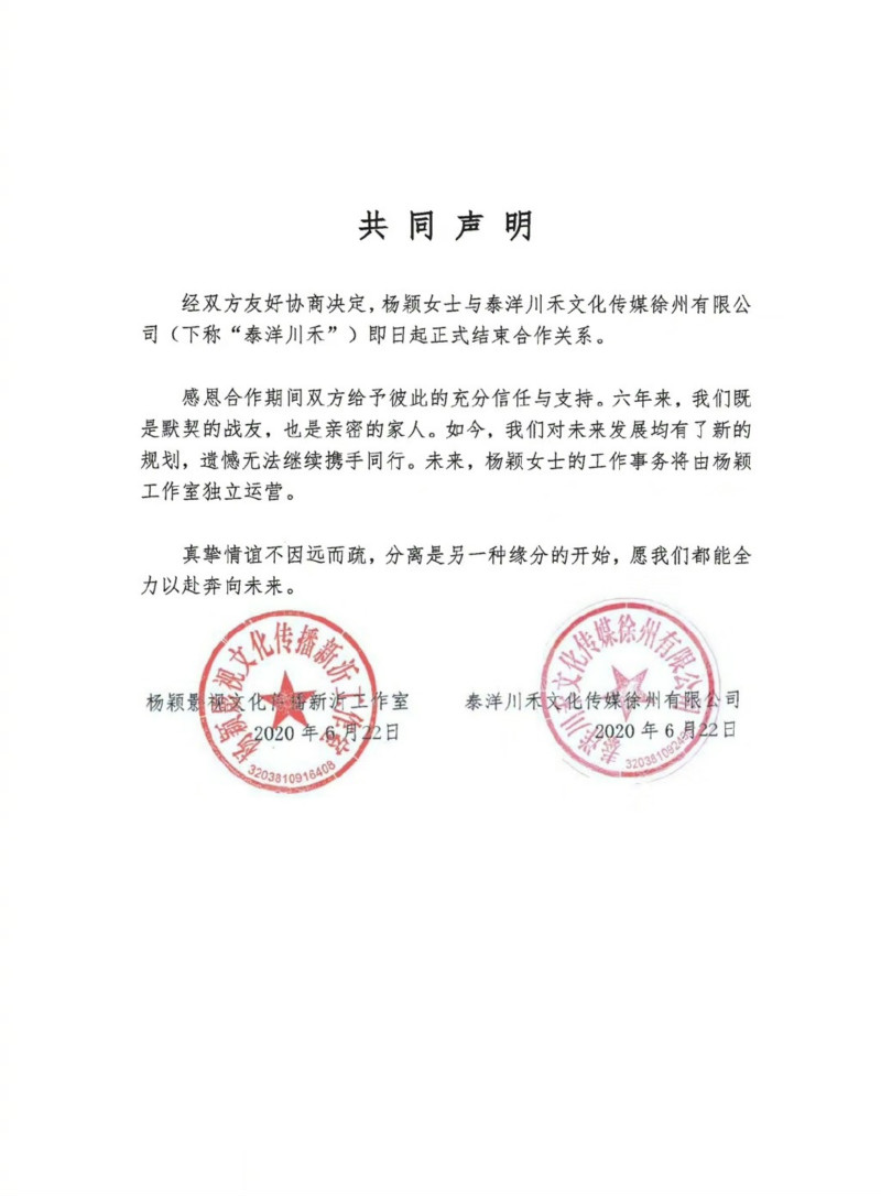 在共同聲明內,表示Angelababy與泰洋川禾即日起正式結束合作關係。這六年來,雙方的合作都獲得了充分的信任和支持,”我們對未來发展均有了新的規劃,遺憾無法繼續攜手同行,未來,楊穎的工作事務將由楊穎工作室單獨運營。”