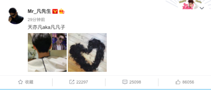 結果沒想到凡凡子沒讓我們等太久,速速就更新了自己理髮後的情況!表示:「天亦凡aka凡凡子」