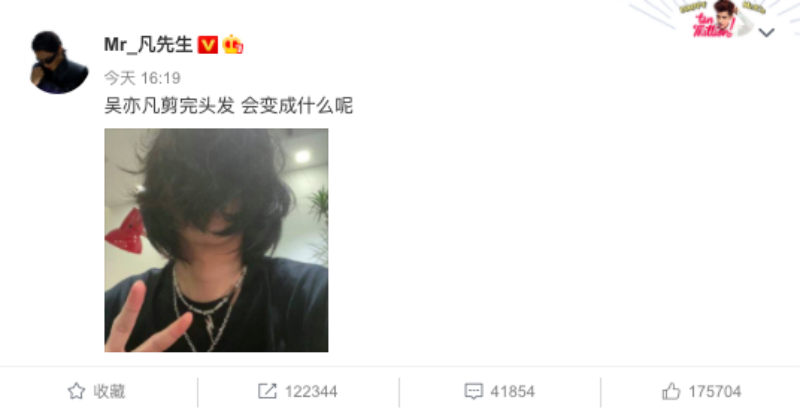 嗚哇!來蹲蹲看吳亦凡最新造型!吳亦凡20號下午發博,曬出了自己遮臉長髮,配文:「吳亦凡剪完頭髮會變成什麽呢?」