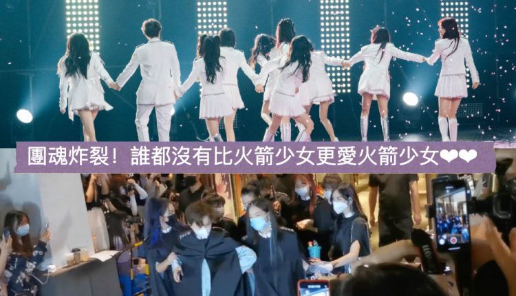 火箭少女孟美岐、吳宣儀、段奧娟、紫寧、賴美雲、sunnee楊芸晴、李紫婷、傅菁、徐夢潔一起圍住Yamy,一路護送直到上車!注意看的話,可以發現全員都穿著印有火箭團體標志的專屬披風!