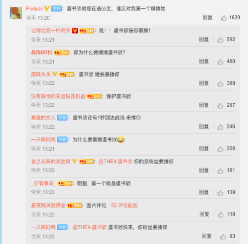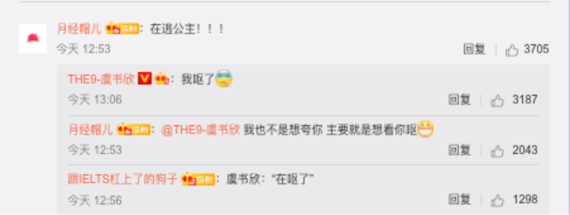還有粉絲回復表示:「虞書欣就是在逃公主,誰反對我第一個爆揍她!」,結果一堆粉絲回復表示第一個反對的就是虞書欣本人啊!並紛紛艾特虞書欣出來!「危!!虞書欣被你暴揍!」、「你為什麽要爆揍虞書欣?」、「虞書欣 她要暴揍你!」、「保護虞書欣」、「虞書欣還有1秒到達戰場 來揍你」、「為什麽要暴揍虞書欣[笑cry]」、「@THE9-虞書欣 你的親粉絲要揍你」、「第一個就是虞書欣」、「虞書欣快來,你粉絲要揍你」等!