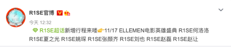 原來是因為中午時分,R1SE官微官宣了R1SE七位成員,分別是何洛洛、夏之光、姚琛、張顏齊、劉也、趙磊和趙讓將出席晚上的ELLEMEN盛典活動!