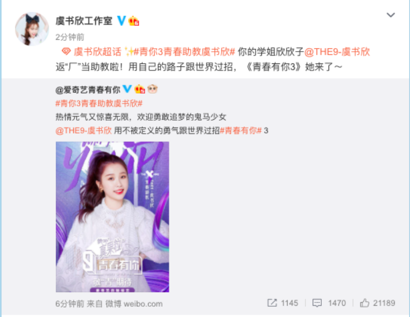 綜藝新聞 官宣!虞書欣《青春有你3》青春助教!哇哦回來啦!!! By 飯圈第一追星大戶 On Jan 11, 2021 Share 哇哦~~~~真的官宣了!!是噠!我們的欣欣子虞書欣,真的成為《青春有你3》的青春助教啦!!! 來看看青你3官宣文:「熱情元氣又驚喜無限,歡迎勇敢追夢的鬼馬少女!@THE9-虞書欣 用不被定義的勇氣跟世界過招#青春有你# 3 」虞書欣工作室也轉發,表示:「你的學姐欣欣子@THE9-虞書欣 返“廠”當助教啦!用自己的路子跟世界過招,《青春有你3》她來了~」 那…可以pick哇哦學姐欣欣子嗎?顆顆顆顆~期待啊! 圖來源:部分照片取自網絡,若侵權請告知 THE9虞書欣青春有你 Share