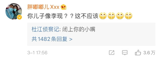 這麼一對比,確實側臉角度好像李現mini版!但網友熱評第一很歪樓,因為寫到:「你兒子像李現?這不應該」搞得杜江都忍不住回覆:「閉上你的小嘴」哈哈哈哈哈!