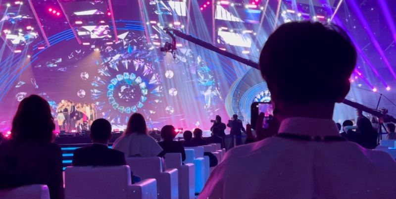 但…這麼多人急著合照的丁真,在台下卻忙著拍THE9!